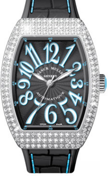 Корпус часов Franck Muller Vanguard Lady V 35 SC AT изготовлен из белого золота 18к, размером 35 х 50 мм. Рифленая заводная головка расположена на 3 часах. Сапфировое стекло защищает черный гильошированный циферблат с арабскими цифрами, часовой, минутной и секундной стрелками. Модель оснащена мануфактурным швейцарским автоматическим механизмом с 42-часовым запасом хода, функциями индикации часов, минут и секунд (посредством соответствующих центральных стрелок). Поставляется на голубом ремешке из кожи аллигатора с вставкой из белого золота 18к. Корпус инкрустирован белыми бриллиантами.