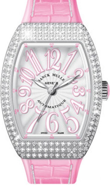 Корпус часов Franck Muller Vanguard Lady V 35 SC AT изготовлен из белого золота 18к, размером 35 х 50 мм. Рифленая заводная головка расположена на 3 часах. Сапфировое стекло защищает серебристый гильошированный циферблат с арабскими цифрами, часовой, минутной и секундной стрелками. Модель оснащена мануфактурным швейцарским автоматическим механизмом с 42-часовым запасом хода, функциями индикации часов, минут и секунд (посредством соответствующих центральных стрелок). Поставляется на розовом ремешке из кожи аллигатора с вставкой из белого золота 18к. Корпус инкрустирован белыми бриллиантами.
