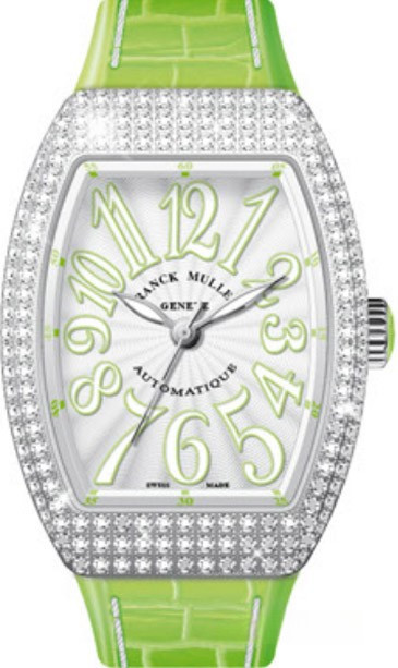 Корпус часов Franck Muller Vanguard Lady V 35 SC AT изготовлен из белого золота 18к, размером 35 х 50 мм. Рифленая заводная головка расположена на 3 часах. Сапфировое стекло защищает серебристый гильошированный циферблат с арабскими цифрами, часовой, минутной и секундной стрелками. Модель оснащена мануфактурным швейцарским автоматическим механизмом с 42-часовым запасом хода, функциями индикации часов, минут и секунд (посредством соответствующих центральных стрелок). Поставляется на зеленом ремешке из кожи аллигатора с вставкой из белого золота 18к. Корпус инкрустирован белыми бриллиантами.