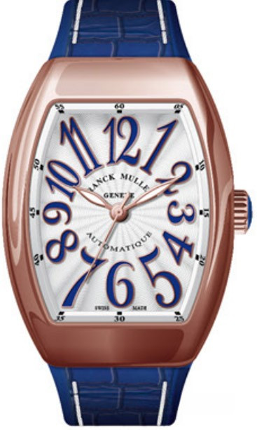 Корпус часов Franck Muller Vanguard Lady V 35 SC AT изготовлен из розового золота 18к, размером 35 х 50 мм. Рифленая заводная головка расположена на 3 часах. Сапфировое стекло защищает серебристый гильошированный циферблат с арабскими цифрами, часовой, минутной и секундной стрелками. Модель оснащена мануфактурным швейцарским автоматическим механизмом с 42-часовым запасом хода, функциями индикации часов, минут и секунд (посредством соответствующих центральных стрелок). Поставляется на синем ремешке из кожи аллигатора с вставкой из розового золота 18к.
