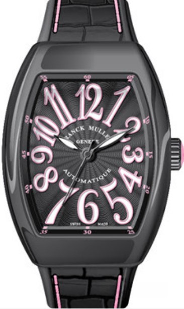 Корпус часов Franck Muller Vanguard Lady V 35 SC AT изготовлен из нержавеющей стали с черным покрытием DLC, размером 35 х 50 мм. Рифленая заводная головка расположена на 3 часах. Сапфировое стекло защищает черный гильошированный циферблат с арабскими цифрами, часовой, минутной и секундной стрелками. Модель оснащена мануфактурным швейцарским автоматическим механизмом с 42-часовым запасом хода, функциями индикации часов, минут и секунд (посредством соответствующих центральных стрелок). Поставляется на черном ремешке из кожи аллигатора с вставкой из нержавеющей стали.