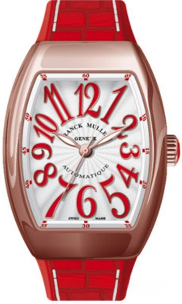 Корпус часов Franck Muller Vanguard Lady V 35 SC AT изготовлен из розового золота 18к, размером 35 х 50 мм. Рифленая заводная головка расположена на 3 часах. Сапфировое стекло защищает серебристый гильошированный циферблат с арабскими цифрами, часовой, минутной и секундной стрелками. Модель оснащена мануфактурным швейцарским автоматическим механизмом с 42-часовым запасом хода, функциями индикации часов, минут и секунд (посредством соответствующих центральных стрелок). Поставляется на красном ремешке из кожи аллигатора с вставкой из розового золота 18к.