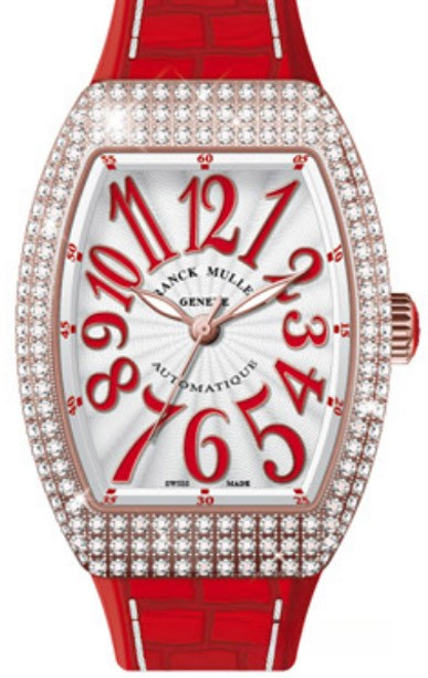 Корпус часов Franck Muller Vanguard Lady V 35 SC AT изготовлен из розового золота 18к, размером 35 х 50 мм. Рифленая заводная головка расположена на 3 часах. Сапфировое стекло защищает серебристый гильошированный циферблат с арабскими цифрами, часовой, минутной и секундной стрелками. Модель оснащена мануфактурным швейцарским автоматическим механизмом с 42-часовым запасом хода, функциями индикации часов, минут и секунд (посредством соответствующих центральных стрелок). Поставляется на красном ремешке из кожи аллигатора с вставкой из розового золота 18к. Корпус инкрустирован белыми бриллиантами.