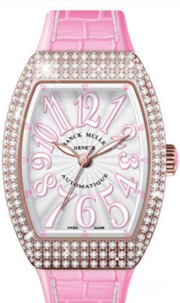 Корпус часов Franck Muller Vanguard Lady V 35 SC AT изготовлен из розового золота 18к, размером 35 х 50 мм. Рифленая заводная головка расположена на 3 часах. Сапфировое стекло защищает серебристый гильошированный циферблат с арабскими цифрами, часовой, минутной и секундной стрелками. Модель оснащена мануфактурным швейцарским автоматическим механизмом с 42-часовым запасом хода, функциями индикации часов, минут и секунд (посредством соответствующих центральных стрелок). Поставляется на розовом ремешке из кожи аллигатора с вставкой из розового золота 18к. Корпус инкрустирован белыми бриллиантами.