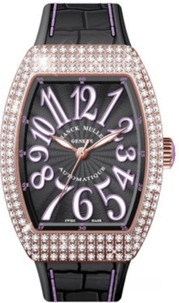Корпус часов Franck Muller Vanguard Lady V 35 SC AT изготовлен из розового золота 18к, размером 35 х 50 мм. Рифленая заводная головка расположена на 3 часах. Сапфировое стекло защищает черный гильошированный циферблат с арабскими цифрами, часовой, минутной и секундной стрелками. Модель оснащена мануфактурным швейцарским автоматическим механизмом с 42-часовым запасом хода, функциями индикации часов, минут и секунд (посредством соответствующих центральных стрелок). Поставляется на черном ремешке из кожи аллигатора с вставкой из розового золота 18к. Корпус инкрустирован белыми бриллиантами.