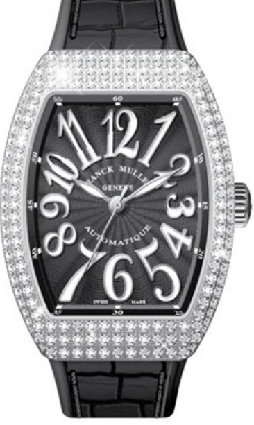 Корпус часов Franck Muller Vanguard Lady V 35 SC AT изготовлен из нержавеющей стали, размером 35 х 50 мм. Рифленая заводная головка расположена на 3 часах. Сапфировое стекло защищает черный гильошированный циферблат с арабскими цифрами, часовой, минутной и секундной стрелками. Модель оснащена мануфактурным швейцарским автоматическим механизмом с 42-часовым запасом хода, функциями индикации часов, минут и секунд (посредством соответствующих центральных стрелок). Поставляется на черном ремешке из кожи аллигатора с вставкой из нержавеющей стали. Корпус инкрустирован белыми бриллиантами.