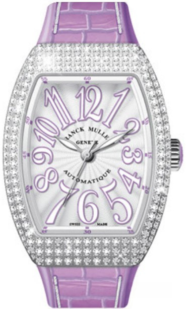Корпус часов Franck Muller Vanguard Lady V 35 SC AT изготовлен из нержавеющей стали, размером 35 х 50 мм. Рифленая заводная головка расположена на 3 часах. Сапфировое стекло защищает серебристый гильошированный циферблат с арабскими цифрами, часовой, минутной и секундной стрелками. Модель оснащена мануфактурным швейцарским автоматическим механизмом с 42-часовым запасом хода, функциями индикации часов, минут и секунд (посредством соответствующих центральных стрелок). Поставляется на сиреневом ремешке из кожи аллигатора с вставкой из нержавеющей стали. Корпус инкрустирован белыми бриллиантами.