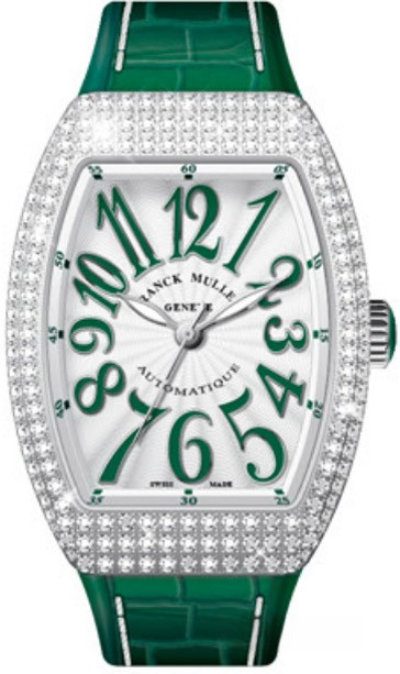 Корпус часов Franck Muller Vanguard Lady V 35 SC AT изготовлен из нержавеющей стали, размером 35 х 50 мм. Рифленая заводная головка расположена на 3 часах. Сапфировое стекло защищает серебристый гильошированный циферблат с арабскими цифрами, часовой, минутной и секундной стрелками. Модель оснащена мануфактурным швейцарским автоматическим механизмом с 42-часовым запасом хода, функциями индикации часов, минут и секунд (посредством соответствующих центральных стрелок). Поставляется на зеленом ремешке из кожи аллигатора с вставкой из нержавеющей стали. Корпус инкрустирован белыми бриллиантами.