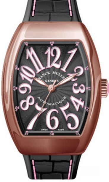 Корпус часов Franck Muller Vanguard Lady V 35 SC AT изготовлен из розового золота 18к, размером 35 х 50 мм. Рифленая заводная головка расположена на 3 часах. Сапфировое стекло защищает черный гильошированный циферблат с арабскими цифрами, часовой, минутной и секундной стрелками. Модель оснащена мануфактурным швейцарским автоматическим механизмом с 42-часовым запасом хода, функциями индикации часов, минут и секунд (посредством соответствующих центральных стрелок). Поставляется на черном ремешке из кожи аллигатора с вставкой из розового золота 18к.