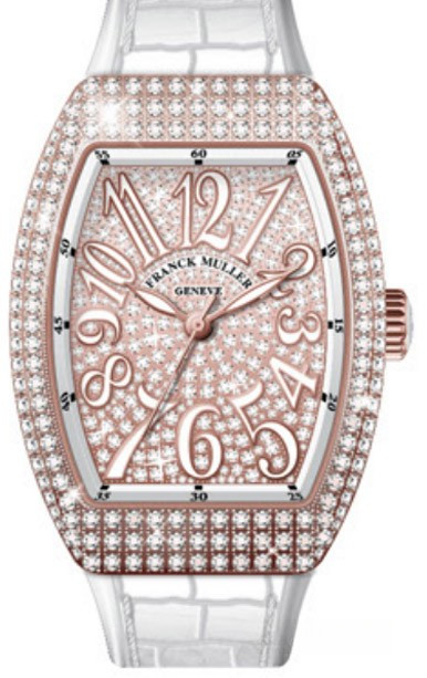 Корпус часов Franck Muller Vanguard Lady V 35 SC AT изготовлен из розового золота 18к, размером 35 х 50 мм. Рифленая заводная головка расположена на 3 часах. Сапфировое стекло защищает циферблат с белыми бриллиантами и арабскими цифрами, часовой, минутной и секундной стрелками. Модель оснащена мануфактурным швейцарским автоматическим механизмом с 42-часовым запасом хода, функциями индикации часов, минут и секунд (посредством соответствующих центральных стрелок). Поставляется на белом ремешке из кожи аллигатора с вставкой из розового золота 18к. Корпус инкрустирован белыми бриллиантами.