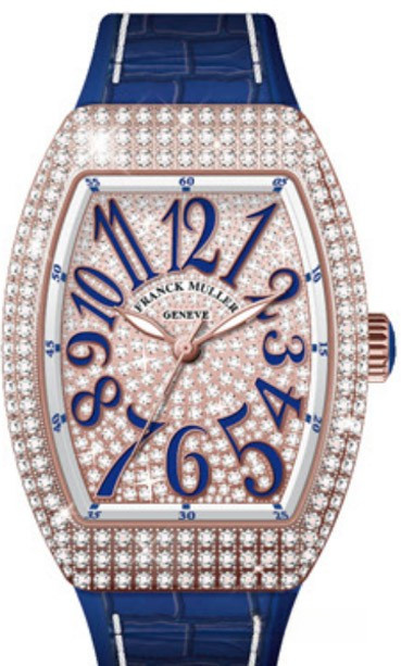 Корпус часов Franck Muller Vanguard Lady V 35 SC AT изготовлен из розового золота 18к, размером 35 х 50 мм. Рифленая заводная головка расположена на 3 часах. Сапфировое стекло защищает циферблат с белыми бриллиантами и арабскими цифрами, часовой, минутной и секундной стрелками. Модель оснащена мануфактурным швейцарским автоматическим механизмом с 42-часовым запасом хода, функциями индикации часов, минут и секунд (посредством соответствующих центральных стрелок). Поставляется на синем ремешке из кожи аллигатора с вставкой из розового золота 18к. Корпус инкрустирован белыми бриллиантами.