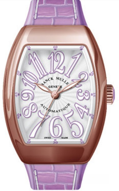 Корпус часов Franck Muller Vanguard Lady V 35 SC AT изготовлен из розового золота 18к, размером 35 х 50 мм. Рифленая заводная головка расположена на 3 часах. Сапфировое стекло защищает серебристый гильошированный циферблат с арабскими цифрами, часовой, минутной и секундной стрелками. Модель оснащена мануфактурным швейцарским автоматическим механизмом с 42-часовым запасом хода, функциями индикации часов, минут и секунд (посредством соответствующих центральных стрелок). Поставляется на сиреневом ремешке из кожи аллигатора с вставкой из розового золота 18к.