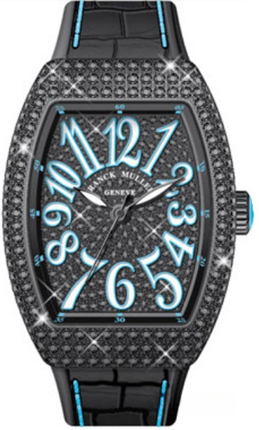 Корпус часов Franck Muller Vanguard Lady V 35 SC AT изготовлен из нержавеющей стали с черным покрытием DLC, размером 35 х 50 мм. Рифленая заводная головка расположена на 3 часах. Сапфировое стекло защищает циферблат с черными бриллиантами и арабскими цифрами, часовой, минутной и секундной стрелками. Модель оснащена мануфактурным швейцарским автоматическим механизмом с 42-часовым запасом хода, функциями индикации часов, минут и секунд (посредством соответствующих центральных стрелок). Поставляется на черном ремешке из кожи аллигатора с вставкой из нержавеющей стали. Корпус инкрустирован черными бриллиантами.