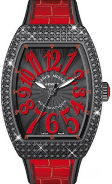 Корпус часов Franck Muller Vanguard Lady V 35 SC AT изготовлен из нержавеющей стали с черным покрытием DLC, размером 35 х 50 мм. Рифленая заводная головка расположена на 3 часах. Сапфировое стекло защищает черный гильошированный циферблат с арабскими цифрами, часовой, минутной и секундной стрелками. Модель оснащена мануфактурным швейцарским автоматическим механизмом с 42-часовым запасом хода, функциями индикации часов, минут и секунд (посредством соответствующих центральных стрелок). Поставляется на красном ремешке из кожи аллигатора с вставкой из нержавеющей стали. Корпус инкрустирован черными бриллиантами.