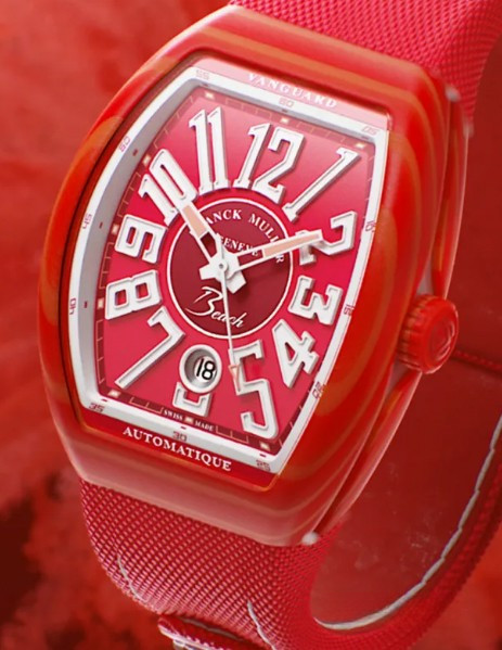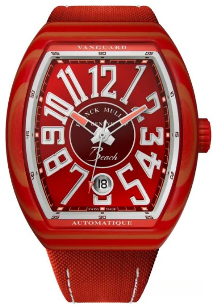Часы Franck Muller Vanguard Beach представлены в корпусе размером 41 х 49.95 х 12.2 мм из карбона водонепроницаемостью 30 метров. Внутри корпуса установлен автоматический механизм, Калибр MVT FM 800-DT, обладающий запасом хода 42 часа. На красном циферблате отображаются часы, минуты, секунды, дата. Часы поставляются на текстильном ремешке с титановой застежкой.