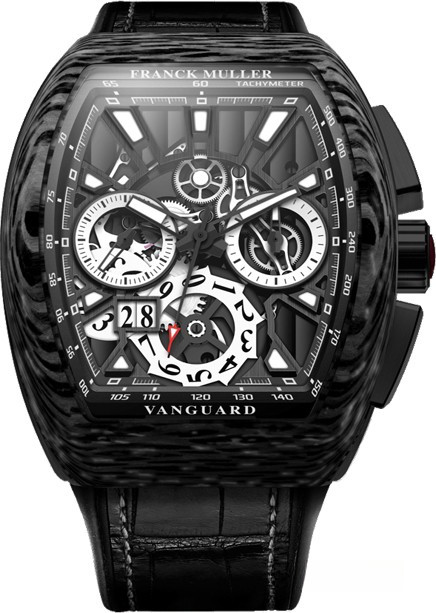 Часы Franck Muller Vanguard Grande Date представлены в корпусе из карбона размером 53.7 х 44 х 12.8 мм и водонепроницаемостью 30 метров. Внутри корпуса установлен автоматический механизм, Калибр FM700, обладающий запасом хода 46 часов. На черном скелетированном циферблате отображаются часы, минуты, секунды, дата, тахиметр, накопители хронографа. Модель комплектуется ремешком из кожи аллигатора с вставкой из титана.