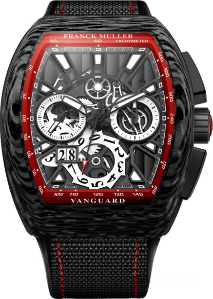Часы Franck Muller Vanguard Grande Date представлены в корпусе из карбона размером 53.7 х 44 х 12.8 мм и водонепроницаемостью 30 метров. Внутри корпуса установлен автоматический механизм, Калибр FM700, обладающий запасом хода 46 часов. На черном скелетированном циферблате отображаются часы, минуты, секунды, дата, тахиметр, накопители хронографа. Модель комплектуется текстильным ремешком с вставкой из титана.
