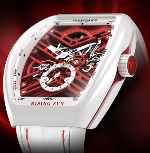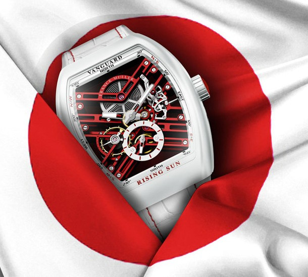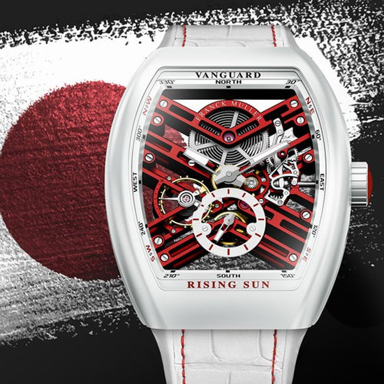 Часы Franck Muller Vanguard Skeleton Rising Sun представлены в корпусе из нержавеющей стали размером 44 x 53.7 х 12.8 мм и водонепроницаемостью до 30 метров. Внутри корпуса установлен механизм с ручным заводом, Калибр FM1740, обладающий запасом хода 7 дней. На красном скелетированном циферблате отображаются часы, минуты и секунды. Часы комплектуются ремешком из кожи аллигатора с вставкой из нержавеющей стали. Серия ограничена - 25 шт.