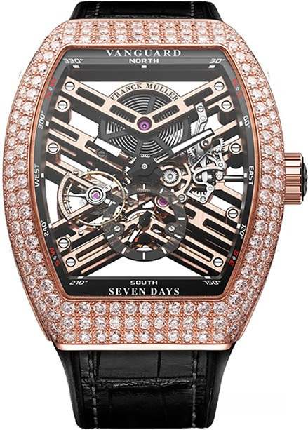 Часы Franck Muller Vanguard Skeleton представлены в корпусе из розового золота 18к с размером 44 x 53.7 мм и водонепроницаемостью до 30 метров. Внутри корпуса установлен автоматический механизм, обладающий запасом хода 48 часов. На золотистом скелетированном циферблате отображаются часы, минуты и секунды. Часы комплектуются ремешком из кожи аллигатора с вставкой из розового золота 18к. Корпус инкрустирован белыми бриллиантами.