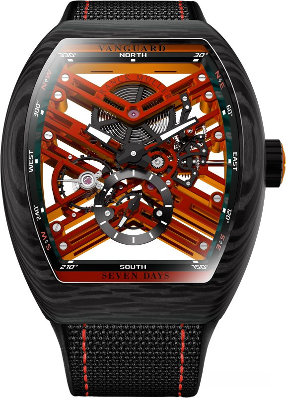 Часы Franck Muller Vanguard Skeleton представлены в корпусе из карбона размером 44 x 53.7 х 12.8 мм и водонепроницаемостью до 30 метров. Внутри корпуса установлен механизм с ручным заводом, Калибр FM1740, обладающий запасом хода 7 дней. На красном скелетированном циферблате отображаются часы, минуты, секунды. Часы комплектуются текстильным ремешком с застежкой из нержавеющей стали.