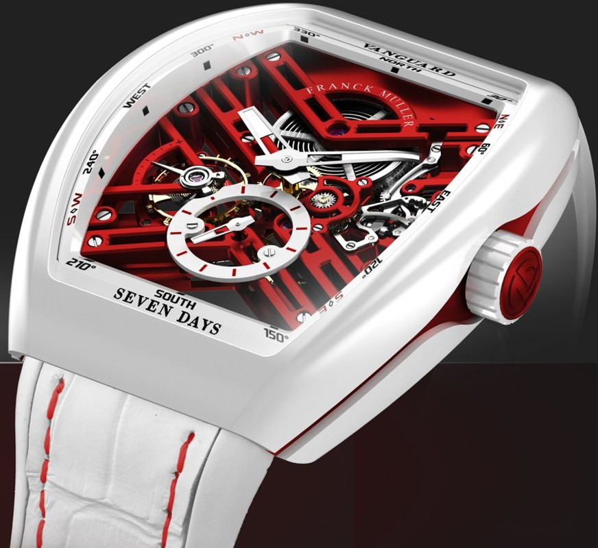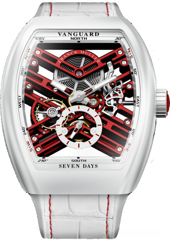 Часы Franck Muller Vanguard Skeleton представлены в корпусе из титана размером 44 x 53.7 х 12.8 мм и водонепроницаемостью до 30 метров. Внутри корпуса установлен механизм с ручным заводом, Калибр FM1740, обладающий запасом хода 7 дней. На красном скелетированном циферблате отображаются часы, минуты и секунды. Часы комплектуются ремешком из кожи аллигатора с вставкой из титана. Серия ограничена.