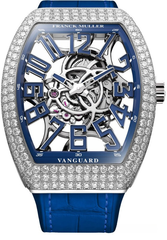 Часы Franck Muller Vanguard Slim Skeleton представлены в корпусе размером 41 х 9.1 мм из нержавеющей стали водонепроницаемостью 30 метров. Внутри корпуса установлен автоматический механизм, обладающий запасом хода 38 часов. На синем циферблате отображаются часы, минуты. Часы поставляются на ремешке из кожи аллигатора с застежкой из нержавеющей стали. Корпус инкрустирован белыми бриллиантами.