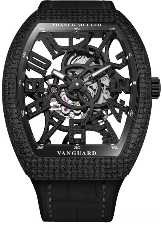Часы Franck Muller Vanguard Slim Skeleton представлены в корпусе размером 41 х 9.1 мм из титана с покрытием DLC водонепроницаемостью 30 метров. Внутри корпуса установлен автоматический механизм, обладающий запасом хода 38 часов. На черном циферблате отображаются часы, минуты. Часы поставляются на ремешке из кожи аллигатора с титановой застежкой. Корпус инкрустирован черными бриллиантами.