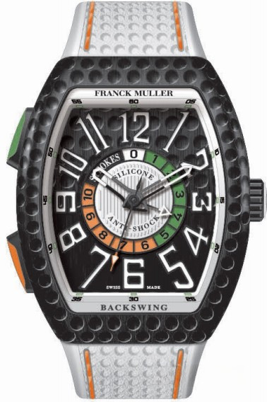 Модель часов Franck Muller Vanguard V 45 Backswing идеально подходит для тех, кто хочет играть в гольф. Эстетика хронометра отвечает эстетическим атрибуты гольфа. Корпус выполнен из титана с черным покрытием DLC. Корпус и циферблат были обработаны с помощью специальной машины, чтобы получить текстуру мяча для гольфа. Центральное расположение счетчика ударов в гольфе позволяет владельцу отслеживать все удары без затруднений. Внутри корпуса установлен автоматический Калибр FM 800 CGS с запасом хода 42 часа. Часы поставляются на интегрированном каучуковом ремешке.