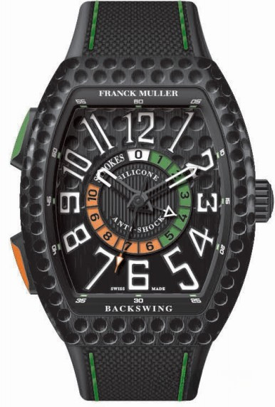 Модель часов Franck Muller Vanguard V 45 Backswing идеально подходит для тех, кто хочет играть в гольф. Эстетика хронометра отвечает эстетическим атрибуты гольфа. Корпус выполнен из титана с черным покрытием DLC. Корпус и циферблат были обработаны с помощью специальной машины, чтобы получить текстуру мяча для гольфа. Центральное расположение счетчика ударов в гольфе позволяет владельцу отслеживать все удары без затруднений. Внутри корпуса установлен автоматический Калибр FM 800 CGS с запасом хода 42 часа. Часы поставляются на интегрированном каучуковом ремешке.