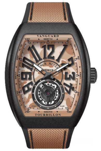 Часы Franck Muller Vanguard V 45 Camouflage с турбийоном изготовлены из титана с черным покрытием DLC, на текстильном ремешке. Бочкообразный корпус имеет размеры 53.7 × 44 х 15.8 мм. Задняя стенка корпуса часов закрытая. Сапфировое стекло с антибликовым покрытием. Циферблат коричневый камуфляжный. Его окружность украшена крупными арабскими цифрами и двумя стрелками. Каретка парящего турбийона заняла всю нижнюю часть циферблата. Рифленая заводная головка расположена на 3-х часах. Водонепроницаемость составляет 30 метров. Внутри корпуса установлен автоматический механизм с запасом хода 42 часа.