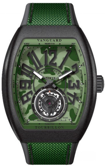 Часы Franck Muller Vanguard V 45 Camouflage с турбийоном изготовлены из титана с черным покрытием DLC, на текстильном ремешке. Бочкообразный корпус имеет размеры 53.7 × 44 х 15.8 мм. Задняя стенка корпуса часов закрытая. Сапфировое стекло с антибликовым покрытием. Циферблат зеленый камуфляжный. Его окружность украшена крупными арабскими цифрами и двумя стрелками. Каретка парящего турбийона заняла всю нижнюю часть циферблата. Рифленая заводная головка расположена на 3-х часах. Водонепроницаемость составляет 30 метров. Внутри корпуса установлен автоматический механизм с запасом хода 42 часа.