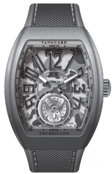 Часы Franck Muller Vanguard V 45 Camouflage с турбийоном изготовлены из титана, на текстильном ремешке. Бочкообразный корпус имеет размеры 53.7 × 44 х 15.8 мм. Задняя стенка корпуса часов закрытая. Сапфировое стекло с антибликовым покрытием. Циферблат серый камуфляжный. Его окружность украшена крупными арабскими цифрами и двумя стрелками. Каретка парящего турбийона заняла всю нижнюю часть циферблата. Рифленая заводная головка расположена на 3-х часах. Водонепроницаемость составляет 30 метров. Внутри корпуса установлен автоматический механизм с запасом хода 42 часа.