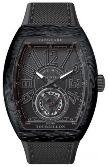 Часы Franck Muller Vanguard V 45 T с турбийоном изготовлены из карбона, на текстильном ремешке. Бочкообразный корпус имеет размеры 53.7 × 44 х 15.8 мм. Задняя стенка корпуса часов закрытая. Сапфировое стекло с антибликовым покрытием. Циферблат черный. Его окружность украшена крупными арабскими цифрами и двумя стрелками. Каретка парящего турбийона заняла всю нижнюю часть циферблата. Рифленая заводная головка расположена на 3-х часах. Водонепроницаемость составляет 30 метров. Внутри корпуса установлен автоматический механизм с запасом хода 42 часа.