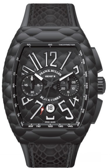 Часы Franck Muller Vanguard V 45 Cobra с хронографом изготовлены из нержавеющей стали с черным покрытием PVD, на кожаном ремешке. Бочкообразный корпус имеет размеры 53.7 × 44 х 15.8 мм. Задняя стенка корпуса часов закрытая. Сапфировое стекло с антибликовым покрытием. Циферблат черный. Его окружность украшена крупными арабскими цифрами и двумя стрелками. Рифленая заводная головка расположена на 3-х часах. Водонепроницаемость составляет 30 метров. Внутри корпуса установлен автоматический механизм с запасом хода 42 часа.