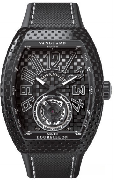 Часы Franck Muller Vanguard V 45 PXLс турбийоном изготовлены из нержавеющей стали с черным покрытием DLC, на ремешке из каучука. Бочкообразный корпус имеет размеры 53.7 × 44 х 15.8 мм. Задняя стенка корпуса часов закрытая. Сапфировое стекло с антибликовым покрытием. Циферблат черный. Его окружность украшена крупными арабскими цифрами и двумя стрелками. Каретка парящего турбийона заняла всю нижнюю часть циферблата. Рифленая заводная головка расположена на 3-х часах. Водонепроницаемость составляет 30 метров. Внутри корпуса установлен автоматический механизм с запасом хода 42 часа.