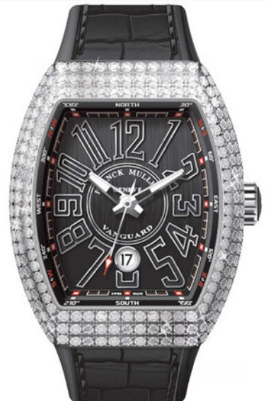Часы Franck Muller Vanguard V 45 SC DT представлены в корпусе из нержавеющей стали размером 44 х 53.7 х 12.8 мм и водонепроницаемостью 30 метров. Внутри корпуса установлен автоматический механизм, Калибр FM 0800 с запасом хода 42 часа. На черном циферблате отображаются часы, минуты, секунды, дата. Часы поставляются на черном ремешке из кожи аллигатора с вставкой из нержавеющей стали. Корпус инкрустирован белыми бриллиантами.