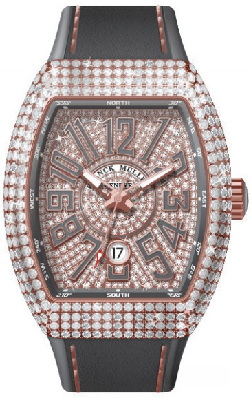 Часы Franck Muller Vanguard V 45 SC DT представлены в корпусе из розового золота 18к размером 44 х 53.7 х 12.8 мм и водонепроницаемостью 30 метров. Внутри корпуса установлен автоматический механизм, Калибр FM 0800 с запасом хода 42 часа. На циферблате из белых бриллиантов отображаются часы, минуты, секунды, дата. Часы поставляются на сером ремешке из каучука с вставкой из розового золота 18к. Корпус инкрустирован белыми бриллиантами.