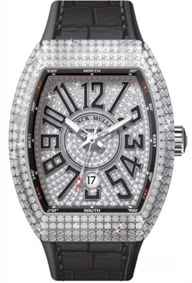 Часы Franck Muller Vanguard V 45 SC DT представлены в корпусе из нержавеющей стали размером 44 х 53.7 х 12.8 мм и водонепроницаемостью 30 метров. Внутри корпуса установлен автоматический механизм, Калибр FM 0800 с запасом хода 42 часа. На циферблате из белых бриллиантов отображаются часы, минуты, секунды, дата. Часы поставляются на черном ремешке из кожи аллигатора с вставкой из нержавеющей стали. Корпус инкрустирован белыми бриллиантами.