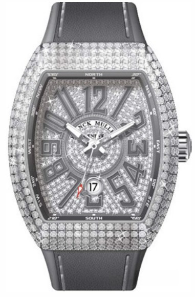 Часы Franck Muller Vanguard V 45 SC DT представлены в корпусе из нержавеющей стали размером 44 х 53.7 х 12.8 мм и водонепроницаемостью 30 метров. Внутри корпуса установлен автоматический механизм, Калибр FM 0800 с запасом хода 42 часа. На циферблате из белых бриллиантов отображаются часы, минуты, секунды, дата. Часы поставляются на сером ремешке из каучука с вставкой из нержавеющей стали. Корпус инкрустирован белыми бриллиантами.
