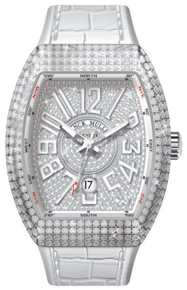 Часы Franck Muller Vanguard V 45 SC DT представлены в корпусе из белого золота 18к размером 44 х 53.7 х 12.8 мм и водонепроницаемостью 30 метров. Внутри корпуса установлен автоматический механизм, Калибр FM 0800 с запасом хода 42 часа. На циферблате с белыми бриллиантами отображаются часы, минуты, секунды, дата. Часы поставляются на белом ремешке из кожи аллигатора с вставкой из белого золота 18к. Корпус инкрустирован белыми бриллиантами.