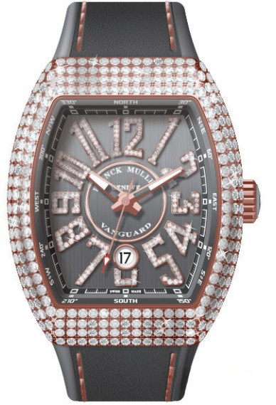 Часы Franck Muller Vanguard V 45 SC DT представлены в корпусе из розового золота 18к размером 44 х 53.7 х 12.8 мм и водонепроницаемостью 30 метров. Внутри корпуса установлен автоматический механизм, Калибр FM 0800 с запасом хода 42 часа. На сером циферблате с белыми бриллиантами отображаются часы, минуты, секунды, дата. Часы поставляются на сером ремешке из каучука с вставкой из розового золота 18к. Корпус инкрустирован белыми бриллиантами.