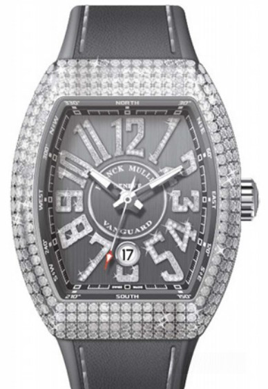 Часы Franck Muller Vanguard V 45 SC DT представлены в корпусе из нержавеющей стали размером 44 х 53.7 х 12.8 мм и водонепроницаемостью 30 метров. Внутри корпуса установлен автоматический механизм, Калибр FM 0800 с запасом хода 42 часа. На сером циферблате с белыми бриллиантами отображаются часы, минуты, секунды, дата. Часы поставляются на сером ремешке из каучука с вставкой из нержавеющей стали. Корпус инкрустирован белыми бриллиантами.