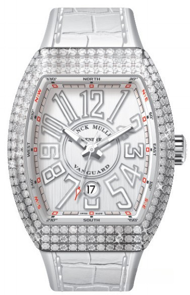 Часы Franck Muller Vanguard V 45 SC DT представлены в корпусе из белого золота 18к размером 44 х 53.7 х 12.8 мм и водонепроницаемостью 30 метров. Внутри корпуса установлен автоматический механизм, Калибр FM 0800 с запасом хода 42 часа. На белом циферблате отображаются часы, минуты, секунды, дата. Часы поставляются на белом ремешке из кожи аллигатора с вставкой из белого золота 18к. Корпус инкрустирован белыми бриллиантами.