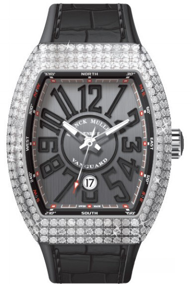 Часы Franck Muller Vanguard V 45 SC DT представлены в корпусе из белого золота 18к размером 44 х 53.7 х 12.8 мм и водонепроницаемостью 30 метров. Внутри корпуса установлен автоматический механизм, Калибр FM 0800 с запасом хода 42 часа. На сером циферблате отображаются часы, минуты, секунды, дата. Часы поставляются на ремешке из кожи аллигатора с вставкой из белого золота 18к. Корпус инкрустирован белыми бриллиантами.