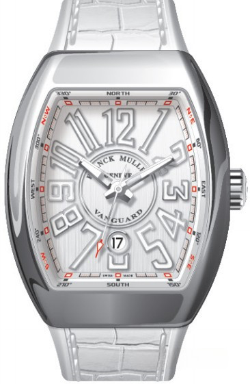 Часы Franck Muller Vanguard V 45 SC DT представлены в корпусе из нержавеющей стали размером 44 х 53.7 х 12.8 мм и водонепроницаемостью 30 метров. Внутри корпуса установлен автоматический механизм, Калибр FM 0800 с запасом хода 42 часа. На белом циферблате отображаются часы, минуты, секунды, дата. Часы поставляются на белом ремешке из кожи аллигатора с вставкой из нержавеющей стали.