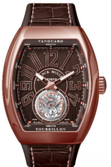 Часы Franck Muller Vanguard V 45 T с турбийоном изготовлены из розового золота 18к, на коричневом ремешке из кожи крокодила. Бочкообразный корпус имеет размеры 53.7 × 44 х 15.8 мм. Задняя стенка корпуса часов закрытая. Сапфировое стекло с антибликовым покрытием. Циферблат коричневого цвета. Его окружность украшена крупными арабскими цифрами и двумя стрелками. Каретка парящего турбийона заняла всю нижнюю часть циферблата. Рифленая заводная головка расположена на 3-х часах. Водонепроницаемость составляет 30 метров. Внутри корпуса установлен автоматический механизм с запасом хода 42 часа.