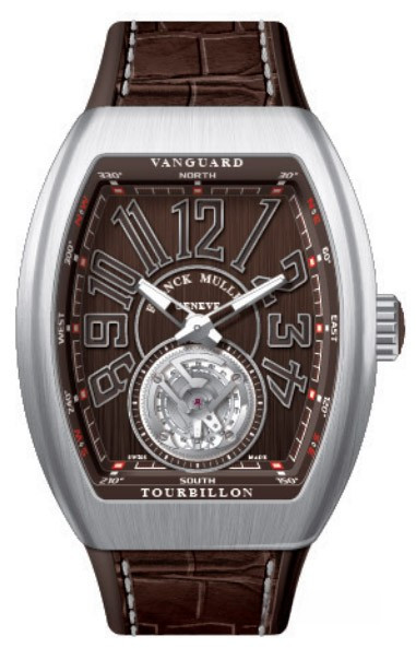 Часы Franck Muller Vanguard V 45 T с турбийоном изготовлены из нержавеющей стали, на ремешке из кожи крокодила. Бочкообразный корпус имеет размеры 53.7 × 44 х 15.8 мм. Задняя стенка корпуса часов закрытая. Сапфировое стекло с антибликовым покрытием. Циферблат коричневого цвета. Его окружность украшена крупными арабскими цифрами и двумя стрелками. Каретка парящего турбийона заняла всю нижнюю часть циферблата. Рифленая заводная головка расположена на 3-х часах. Водонепроницаемость составляет 30 метров. Внутри корпуса установлен автоматический механизм с запасом хода 42 часа.