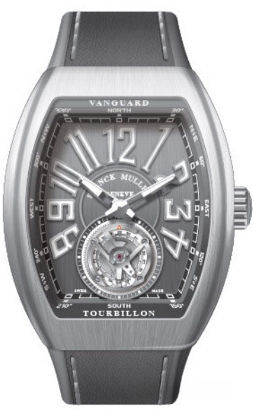 Часы Franck Muller Vanguard V 45 T с турбийоном изготовлены из нержавеющей стали, на кауучуковом ремешке. Бочкообразный корпус имеет размеры 53.7 × 44 х 15.8 мм. Задняя стенка корпуса часов закрытая. Сапфировое стекло с антибликовым покрытием. Циферблат серого цвета. Его окружность украшена крупными арабскими цифрами и двумя стрелками. Каретка парящего турбийона заняла всю нижнюю часть циферблата. Рифленая заводная головка расположена на 3-х часах. Водонепроницаемость составляет 30 метров. Внутри корпуса установлен автоматический механизм с запасом хода 42 часа.