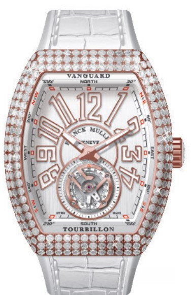 Часы Franck Muller Vanguard V 45 T с турбийоном изготовлены из розового золота 18к, на ремешке из кожи аллигатора. Бочкообразный корпус имеет размеры 53.7 × 44 х 15.8 мм. Задняя стенка корпуса часов закрытая. Сапфировое стекло с антибликовым покрытием. Циферблат белого цвета. Его окружность украшена крупными арабскими цифрами и двумя стрелками. Каретка парящего турбийона заняла всю нижнюю часть циферблата. Рифленая заводная головка расположена на 3-х часах. Водонепроницаемость составляет 30 метров. Внутри корпуса установлен автоматический механизм с запасом хода 42 часа. Корпус инкрустирован белыми бриллиантами.
