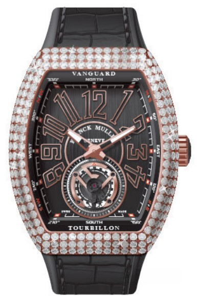 Часы Franck Muller Vanguard V 45 T с турбийоном изготовлены из розового золота 18к, на ремешке из кожи аллигатора. Бочкообразный корпус имеет размеры 53.7 × 44 х 15.8 мм. Задняя стенка корпуса часов закрытая. Сапфировое стекло с антибликовым покрытием. Циферблат черного цвета. Его окружность украшена крупными арабскими цифрами и двумя стрелками. Каретка парящего турбийона заняла всю нижнюю часть циферблата. Рифленая заводная головка расположена на 3-х часах. Водонепроницаемость составляет 30 метров. Внутри корпуса установлен автоматический механизм с запасом хода 42 часа. Корпус инкрустирован белыми бриллиантами.
